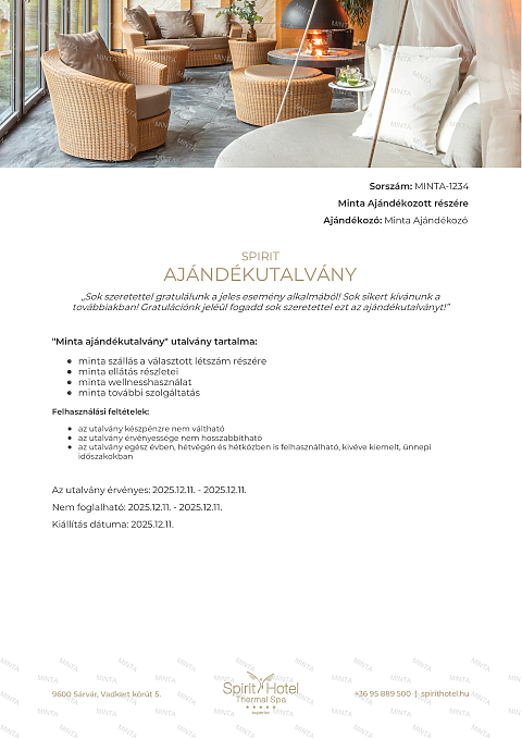 - A Spirit Spa Day utalvány egynapos belépést biztosít a Spirit Hotel exkluzív wellness- és fürdővilágába. Vendégünk korlátlanul használhatja az élmény-, sport- és termálmedencéket, valamint a a harmonikus kikapcsolódást nyújtó exkluzív szaunavilágot. Tökéletes választás egy napnyi feltöltődéshez és teljes kikapcsolódáshoz.