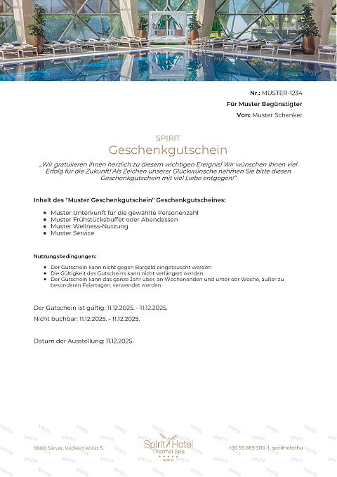 - Der Spirit Spa Day Gutschein berechtigt zu einem ganztägigen Eintritt in die exklusive Wellness- und Badelandschaft des Spirit Hotels. Gäste geniessen uneingeschränkten Zugang zu Erlebnis-, Sport- und Thermalbecken sowie zur harmonischen Entspannung der exklusiven Saunawelt. Die perfekte Wahl für einen Tag voller Regeneration und völliger Entspannung.
