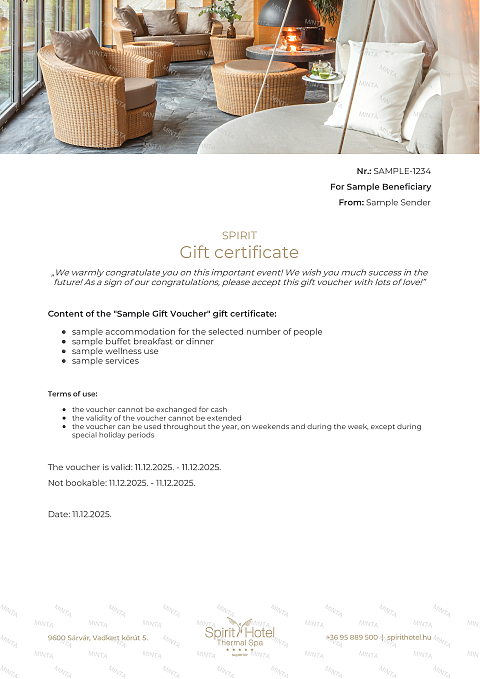 - The Spirit Spa Day certificates grants one-day access to the hotel’s luxurious wellness and bath world. Guests can enjoy unlimited use of the adventure, sport and thermal pools, as well as the harmonious relaxation offered by the exclusive sauna facilities. A perfect choice for a full day of recharge and complete relaxation.
